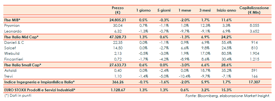 A Milano il Ftse Mib ha archiviato le contrattazioni con un +0,5% a 24.805 punti. L’indice Ingegneria e Impiantistica ha segnato un -0,1%, rispetto al +1,3% del corrispondente indice europeo.