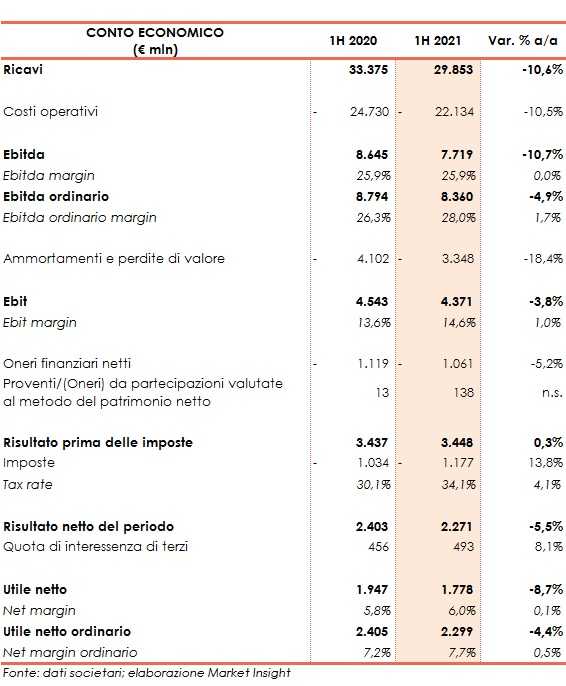 Al lordo delle partite straordinarie l’EBITDA si attesta a 7.719 milioni (8.645 milioni nel 1H 2020, -10,7%).