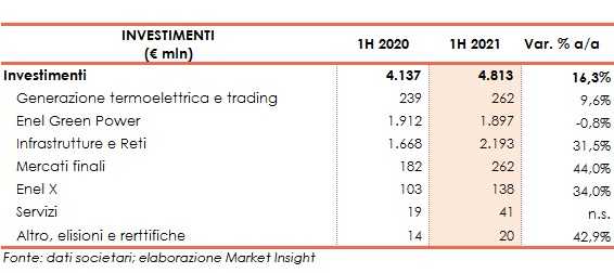 Gli investimenti salgono balzano del 16,3% a 4.813 milioni, che sono stati destinati principalmente alle Infrastrutture e Reti, Mercati finali ed Enel X.