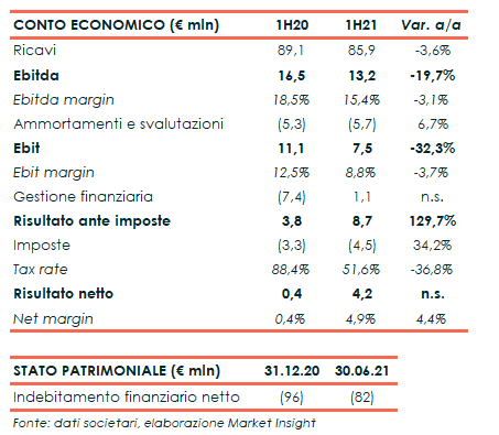 Nei primi sei mesi del 2021, l’Ebitda è diminuito del 19,7% a 13,2 milioni, con una marginalità al 15,4% (-310 unti base). Al netto dell’effetto cambi negativo per 2,2 milioni, l’Ebitda sarebbe stato pari a 15,5 milioni (16,8% dei ricavi consolidati). Il calo organico (-6,2%) è dovuto esclusivamente all’incremento delle spese operative soprattutto per costi corporate non allocati. L’Ebit ha segnato un -32,3% a 7,5 milioni.