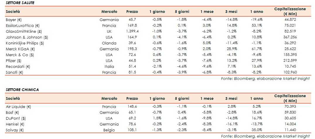 Si riporta l’andamento odierno dei principali titoli internazionali dei settori della Sanità e della Chimica.