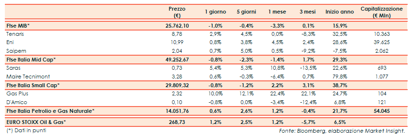 A Milano il Ftse Mib ha terminato le contrattazioni con un -1% a 25.762 punti. Il Ftse Italia Petrolio e Gas Naturale ha segnato un +0,6%, rispetto al +1,2% del corrispondente indice europeo.