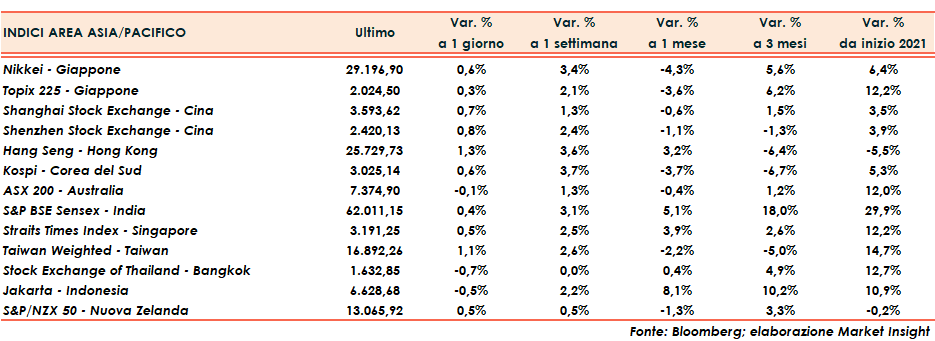 Positivo anche il Giappone con Nikkei +0,6% e Topix +0,3%.