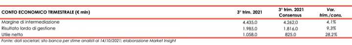 L’istituto di piazza Gae Aulenti ha registrato nel terzo trimestre 2021 un margine di intermediazione pari a 4.435 milioni (4.262 milioni il consensus, +4,1%).