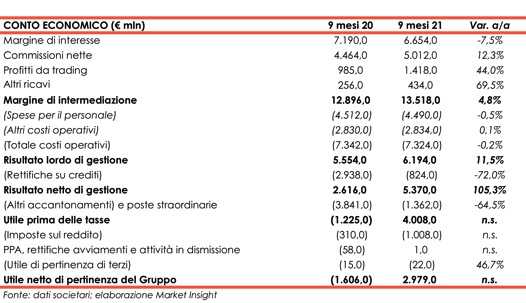 Il risultato lordo di gestione si è pertanto fissato a 6.194 milioni (+11,5%), e, dopo rettifiche su crediti scese a 824 milioni (-72%; nei primi nove mesi del 2020 erano state contabilizzate extra rettifiche legate ai primi impatti del Covid-19), il risultato netto di gestione è ammontato a 5.370 milioni (+105,3%).