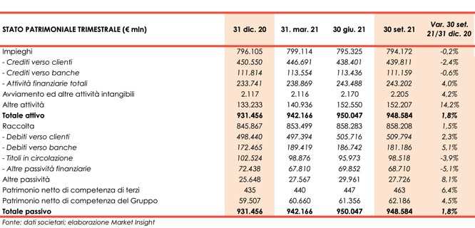 Dal lato patrimoniale, al 30 settembre 2021 gli impieghi restano sostanzialmente stabili a 794,2 miliardi (-0,2% rispetto a fine 2020), al cui interno i crediti verso la clientela diminuiscono a 439,8 miliardi (-2,4% rispetto al 31 dicembre 2020), mentre crescono le attività finanziarie totali (+4% a 243,2 miliardi rispetto a fine 2020).