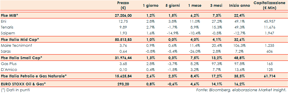 A Milano il Ftse Mib ha archiviato le contrattazioni con il +1,2% a 27.206 punti. Il Ftse Italia Petrolio e Gas Naturale ha segnato un +2,6%, rispetto al +0,8% del corrispondente indice europeo.