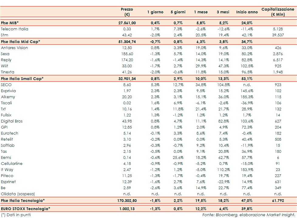 Il Ftse Italia Tecnologia termina a -1,8% a fronte del -0,% dell’Euro Stoxx Tecnologia e del +0,4% del Ftse Mib.