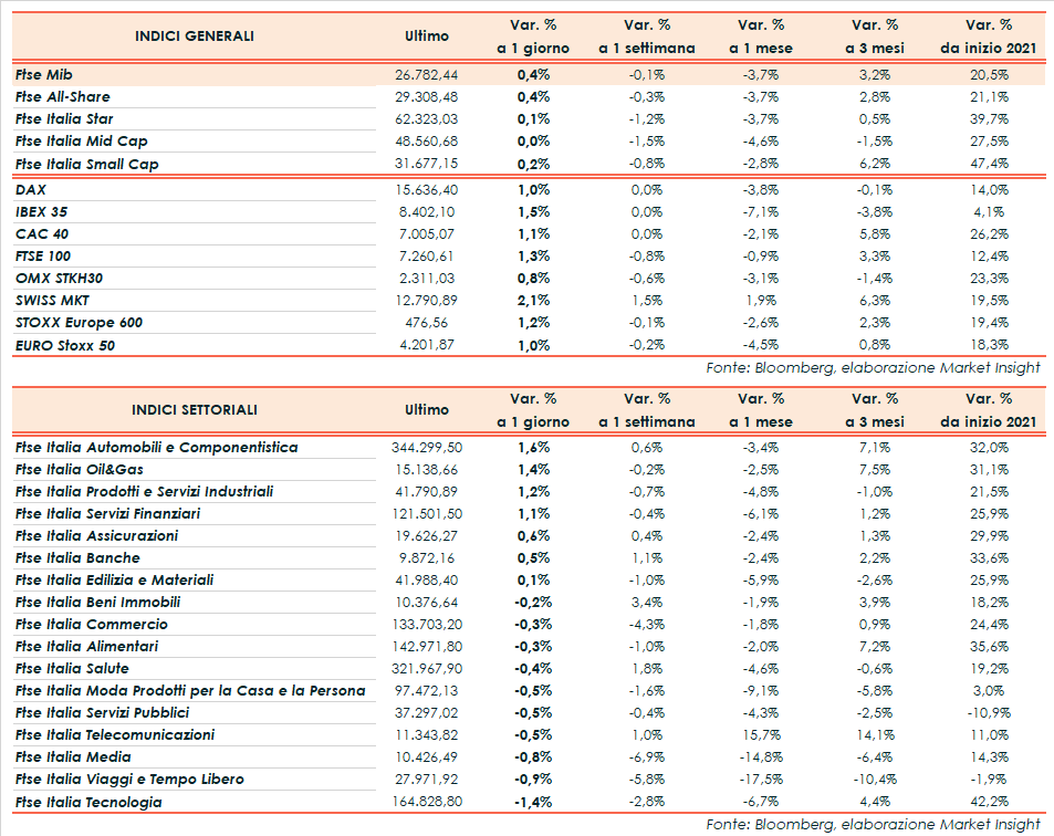 A Piazza Affari il Ftse Mib archivia gli scambi in progresso dello 0,4% a 26.782 punti, arretrato rispetto al Dax di Francoforte (+1%), il Cac 40 di Parigi (+1,1%), il Ftse 100 di Londra (+1,3%) e l’Ibex 35 di Madrid (+1,5%). Oltreoceano si muovono senza una direzione precisa Dow Jones (+0,5%), S&P500 (-0,1%) e Nasdaq (-1,3%), dopo i guadagni della seduta precedente.