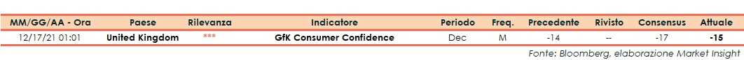 A dicembre l’indice Gfk, che misura la fiducia dei consumatori nel Regno Unito, si è attestato a -15 punti (consensus -17 punti), in miglioramento dai -14 punti di novembre.
