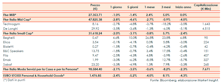 A Milano il Ftse Mib ha archiviato le contrattazioni con un -1% a 27.353 punti. Il Ftse Italia Moda Servizi per la Casa e per la Persona ha segnato un -2,1%, rispetto al -2,4% del corrispondente indice europeo.