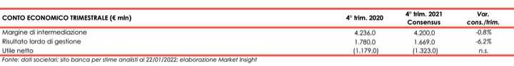 Dal consensus mediano del panel di 19 analisti riportato da UniCredit emerge per il solo quarto trimestre un margine di intermediazione pari a 4.200 milioni (-0,9% rispetto al periodo di confronto), mentre il risultato lordo di gestione dovrebbe fissarsi a 1.669 milioni (-6,2% rispetto al terzo trimestre 2020), con costi operativi in lieve aumento.