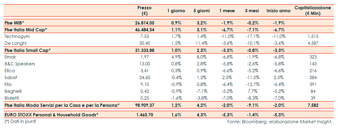 Il Ftse Italia Moda Servizi per la Casa e per la Persona ha segnato un +1,2%, rispetto al +1,6% del corrispondente indice europeo. Nel settore dei beni per la casa ancora acquisti su De’Longhi (+1,5%) dopo i guadagni della scorsa settimana.