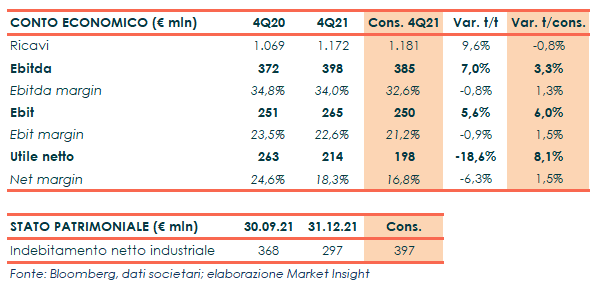 L’indebitamento netto industriale è diminuito a 297 milioni dai 368 milioni al 30 settembre 2021 e rispetto ai 543 milioni al 31 dicembre 2020, con una robusta generazione di free cash flow industriale pari a 642 milioni nell’anno che ha compensato le spese in conto capitale per 737 milioni, l’acquisto di azioni proprie per 231 milioni e il pagamento di dividendi per 162 milioni.