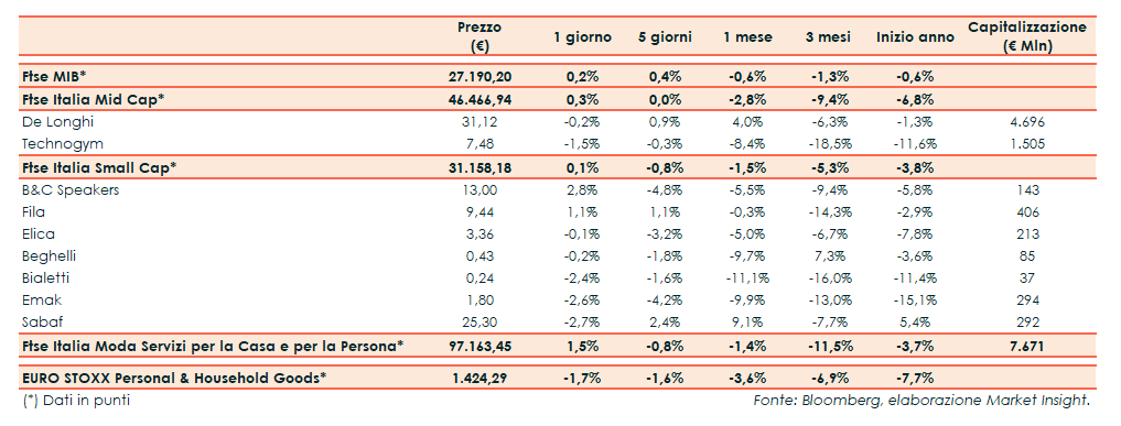 A Milano il Ftse Mib ha archiviato le contrattazioni con un +0,2% a 27.190 punti. Il Ftse Italia Moda Servizi per la Casa e per la Persona ha segnato un +1,5%, rispetto al -1,7% del corrispondente indice europeo.