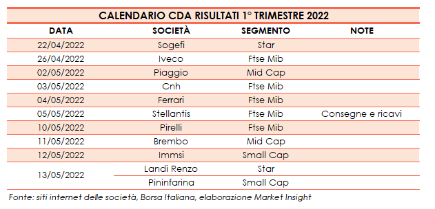 Si riporta di seguito il calendario dei Consigli di Amministrazione per l’approvazione dei conti del primo trimestre del 2022 delle società del comparto Automotive quotate al mercato principale di Borsa Italiana (EXM).