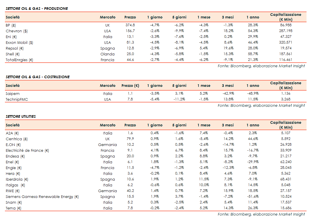 Si riporta l’andamento odierno dei principali titoli internazionali del settore energetico e delle utilities: