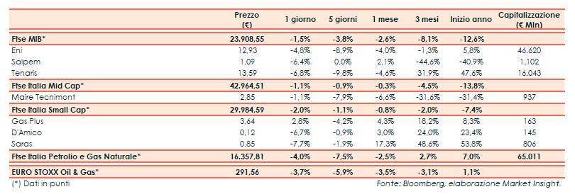 A Milano il Ftse Mib ha archiviato le contrattazioni con un -1,5% a 23.908 punti. Il Ftse Italia Petrolio e Gas Naturale ha segnato un -4%, rispetto al -3,7% del corrispondente indice europeo.