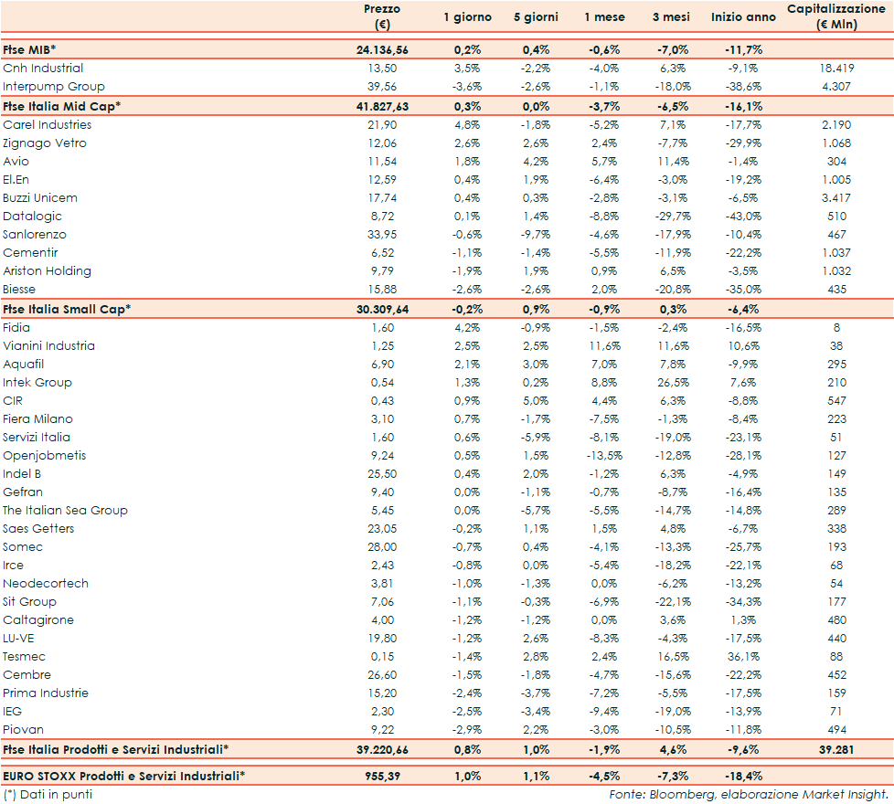 A Milano il Ftse Mib ha archiviato le contrattazioni con un +0,2% a 23,137 punti, frenato dallo stacco della cedola di 19 big. Il Ftse Italia Prodotti e Servizi Industriali ha segnato un +0,8%, inferiore al +1% del corrispondente indice europeo.