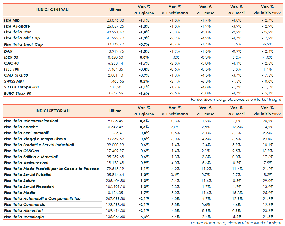Il Ftse Mib di Milano termina in ribasso dell’1,1% a 23.876 punti, sottotono come Dax di Francoforte (-1,8%) e Cac40 di Parigi (-1,7%), mentre chiudono poco distanti dalla parità il Ftse 100 di Londra (-0,4%) e l’Ibex 35 di Madrid (flat).