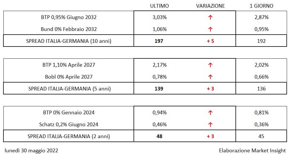 Pomeriggio in deciso rialzo per i tassi europei, mentre le borse europee proseguono poco mosse, con il Ftse Mib a +0,4%, in una giornata che vede Wall Street rimanere chiusa per la festività del Memorial Day.