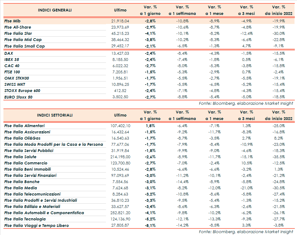 Il Ftse Mib di Milano termina in ribasso del 2,8% a 21.918 punti. In rosso anche il Cac 40 di Parigi (-2,7%), il Dax di Francoforte (-2,4%), l’Ibex 35 di Madrid (-2,4%) e il Ftse 100 di Londra (-1,5%) mentre a Wall Street peggiorano ulteriormente Dow Jones (-2,2%), S&P500 (-2,9%) e Nasdaq (-3,7%).