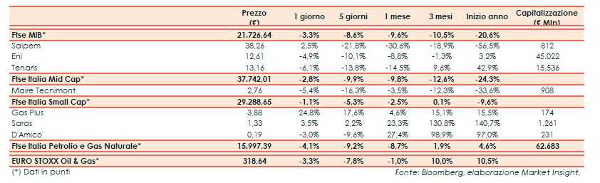 A Milano il Ftse Mib ha archiviato le contrattazioni con un -3,3% a 21.726 punti. Il Ftse Italia Petrolio e Gas Naturale ha segnato un -4,1%, rispetto al -3,3% del corrispondente indice europeo.