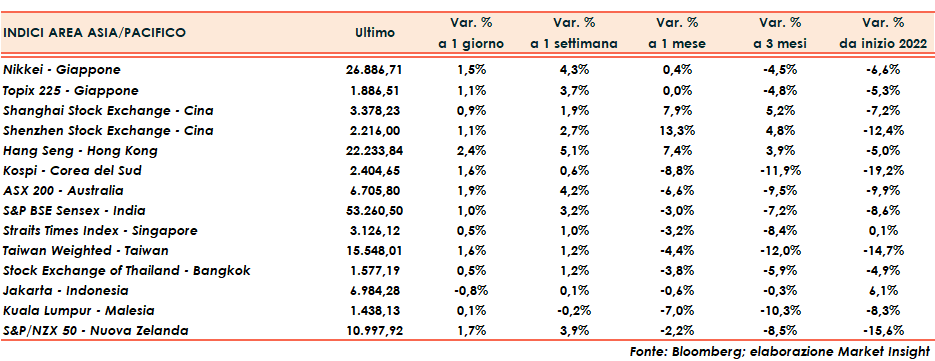 Seduta complessivamente positiva per le principali piazze finanziarie asiatiche, con Hong Kong in evidenza (+2,4%), in un sentiment globale che vede ancora al centro temi come l’inflazione e le prospettive di recessione.
