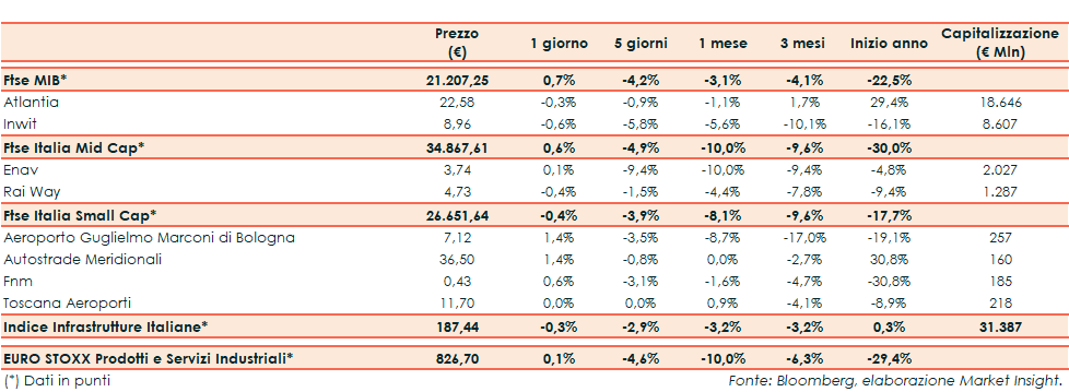 L’indice Infrastrutture Italiane ha chiuso a -0,3%, rispetto al +0,1% del corrispondente indice settoriale europeo e al +0,7% del Ftse Mib.