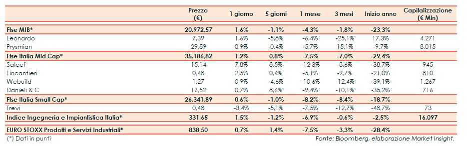 A Milano il Ftse Mib ha archiviato le contrattazioni con un +1,6% a 20.972 punti. L’indice Ingegneria e Impiantistica ha segnato un +1,5%, rispetto al +0,7% del corrispondente indice europeo.