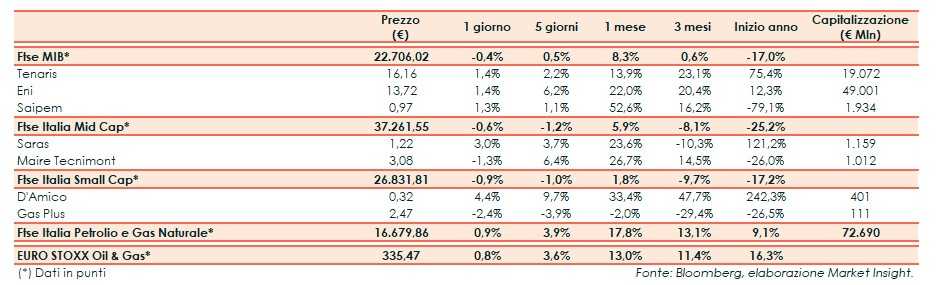 A Milano il Ftse Mib ha archiviato le contrattazioni con un -0,4% a 22.706 punti. Il Ftse Italia Petrolio e Gas Naturale ha segnato un, rispetto al del corrispondente indice europeo.