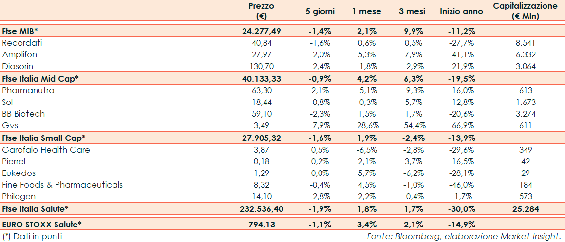 La scorsa settimana il Ftse Italia Salute ha chiuso a -1,9% rispetto al -1,1% del corrispondente europeo e al -1,4% del Ftse Mib.
