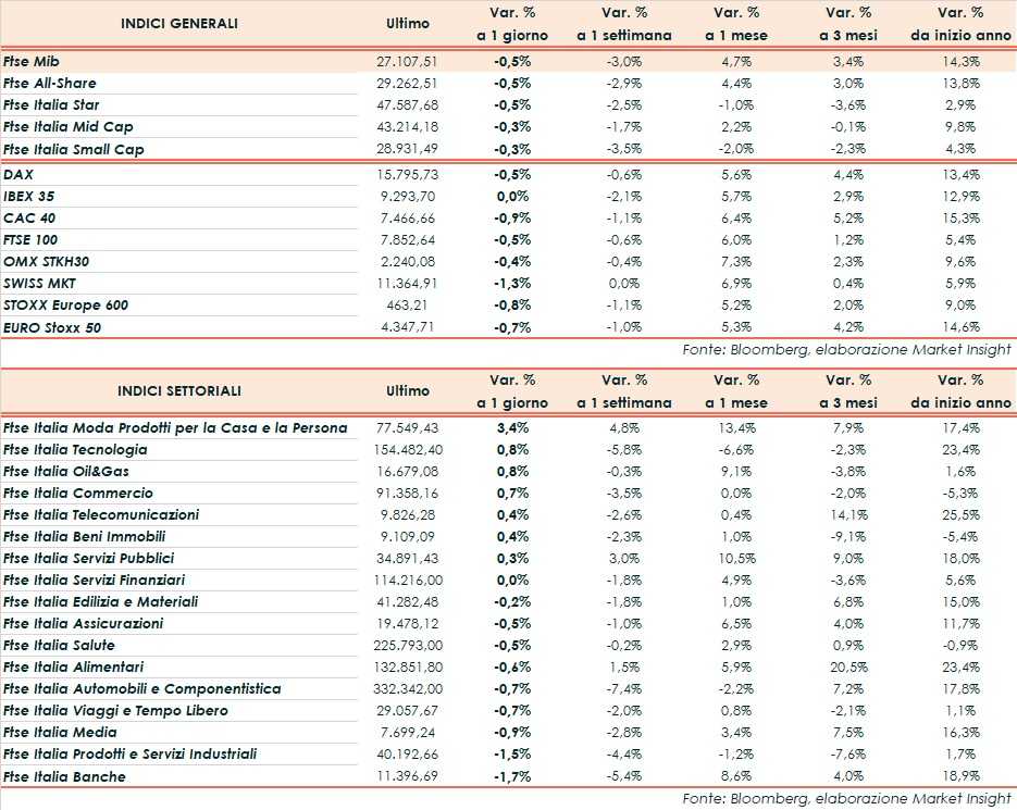 A Milano il Ftse Mib ha archiviato le contrattazioni in area 27.107 punti, in calo dello 0,3%, il CAC 40 di Parigi arretra dello 0,9%, il Dax di Francoforte e il FTSE 1OO di Londra cedono lo 0,5%, mentre l’IBEX 35 di Madrid chiude in parità.