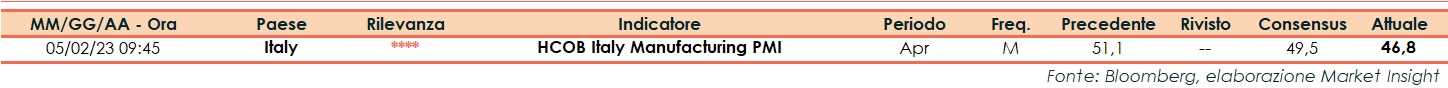 Ad aprile l’indice PMI relativo al Settore Manifatturiero dell’Italia si è attestato a 46,8 punti, al di sotto della stima degli analisti (49,5 punti) e della rilevazione di marzo (51,1 punti).
