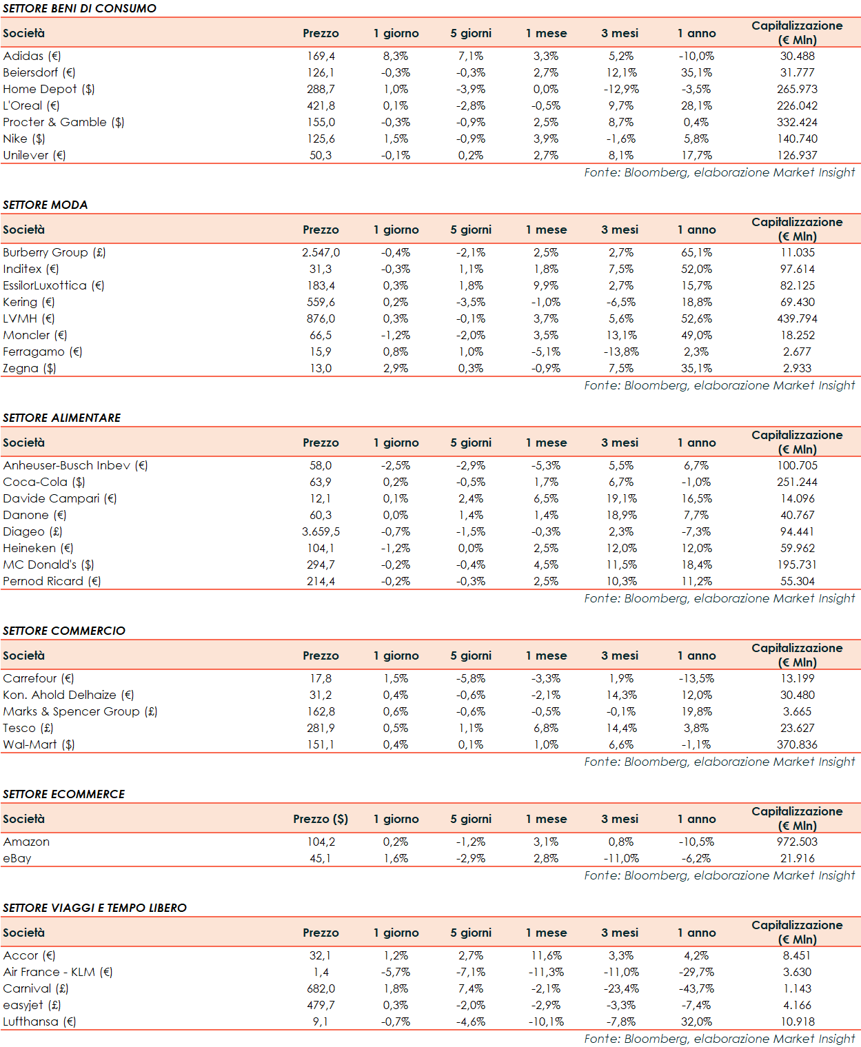 Si riporta l’andamento odierno dei principali titoli internazionali del settore relativo ai beni di consumo: