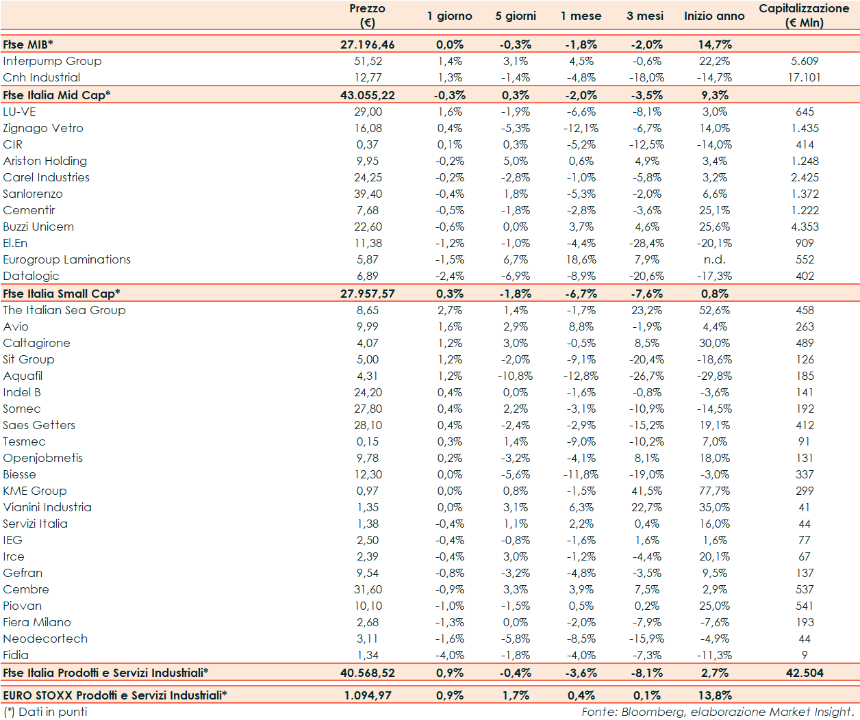 Nella seduta di ieri il Ftse Italia Prodotti e Servizi Industriali ha riportato un +0,9% come il corrispondente europeo e rispetto alla parità del Ftse Mib.