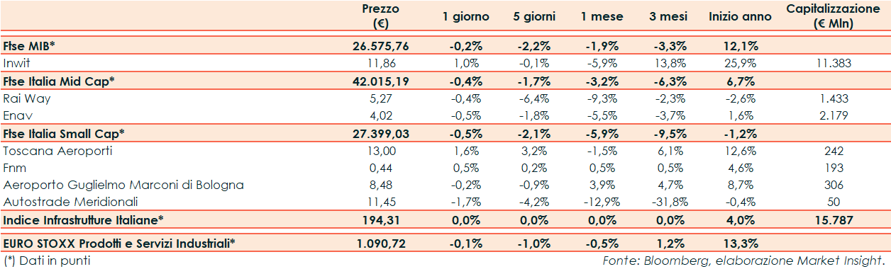 Nella seduta di ieri l’indice Infrastrutture Italiane ha riportato una sostanziale parità rispetto al -0,1% del corrispondente europeo e al -0,2% del Ftse Mib.