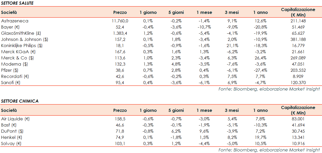 Si riporta l’andamento odierno dei principali titoli internazionali del settore della sanità e della chimica: