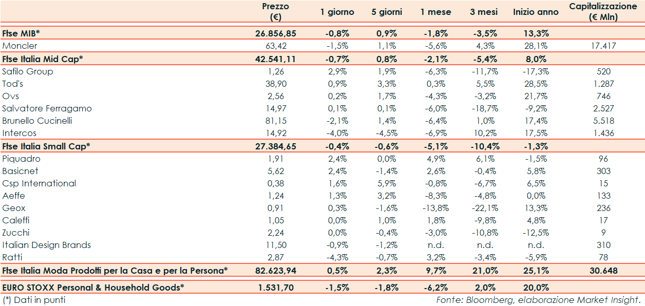 Nella seduta di ieri il Ftse Italia Moda ha riportato un +0,5% rispetto al -1,5% del corrispondente europeo e al -0,8% del Ftse Mib.