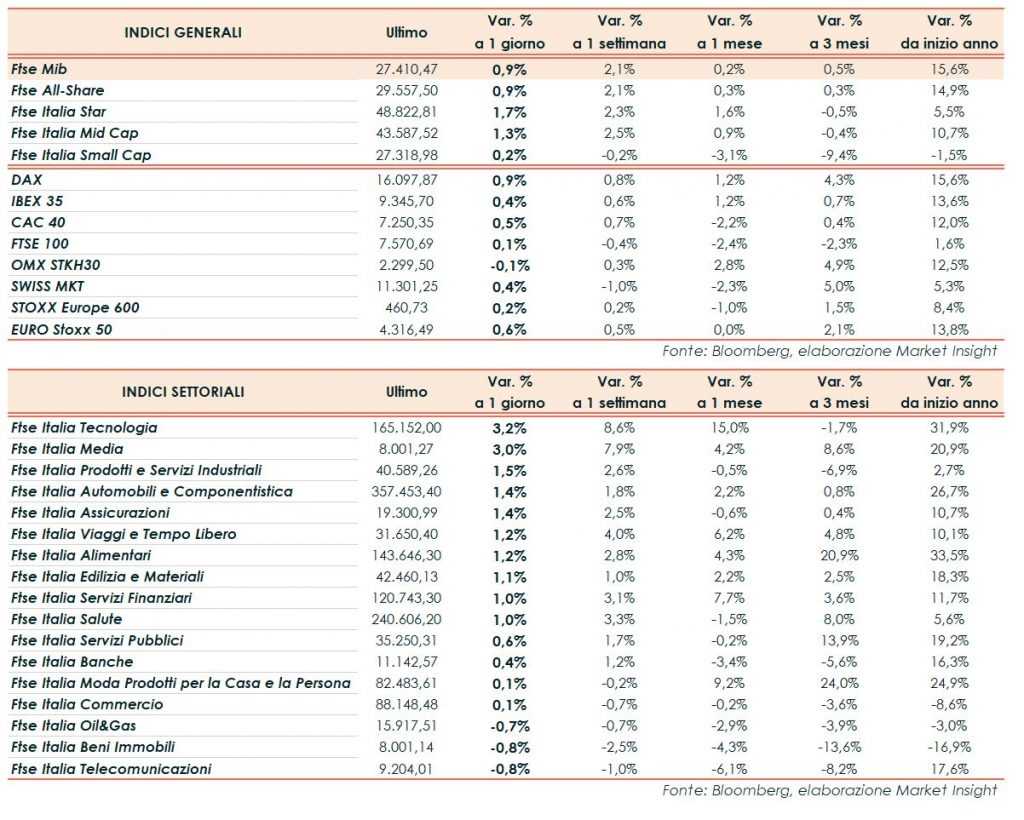 A Milano, il Ftse Mib ha archiviato le contrattazioni in area 27.410 punti, in rialzo dello 0,9%, bene come il Dax di Francoforte (+0,9%), il CAC 40 di Parigi (+0,5%) e l’IBEX 35 di Madrid (+0,4%). Chiude appena sopra la parità il FTSE 100 di Londra (+0,1%).