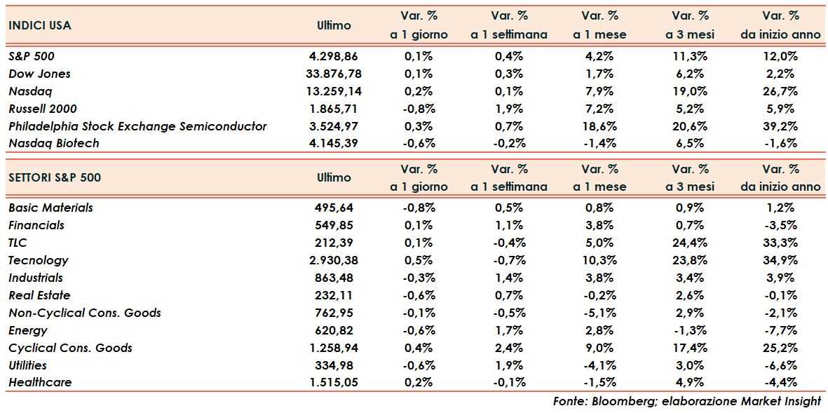 Il bilancio definitivo vede Dow Jones, S&P500 e Nasdaq tutti allineati con un progresso di un decimo di punto percentuale. Il modesto guadagno del listino tecnologico nasconde tuttavia il balzo di alcuni titoli del settore tra i quali Tesla (+4,2%), AMD (3,2%), Netflix (+2,6%).