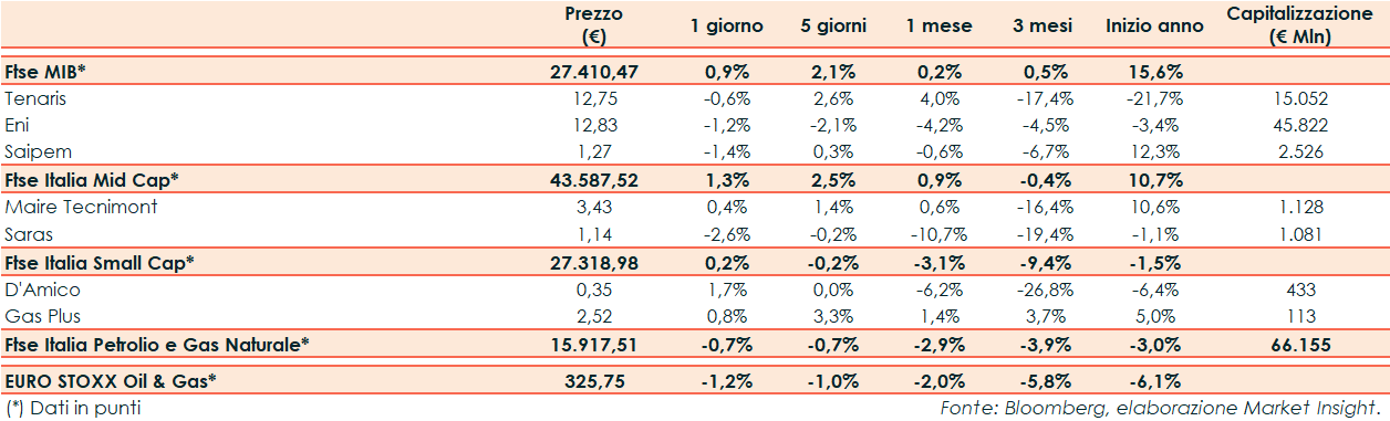 Nella seduta di ieri il Ftse Italia Petrolio e Gas Naturale ha riportato un -0,7% rispetto al -1,2% del corrispondente indice europeo e al +0,9% del Ftse Mib.