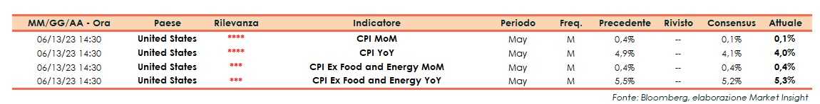 A maggio l’indice dei prezzi al consumo negli Usa ha registrato +0,1% su base mensile, in linea al consensus e dopo il +0,4% di aprile. Anno su anno la variazione si attesta al +4%, leggermente al di sotto del +4,1% stimato e inferiore al +4,9% del mese precedente.