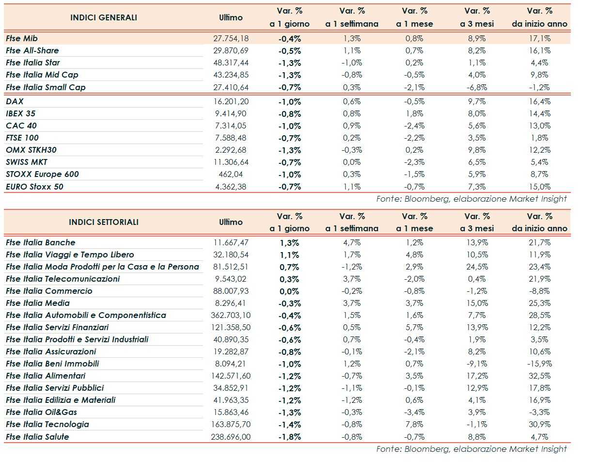 A Milano, il Ftse Mib chiude le contrattazioni in area 27.754 punti cedendo lo 0,4%, negativa come il Cac 40 di Parigi (-1%), il Dax di Francoforte (-1%), l’Ibex 35 di Madrid (-0,8%) e il Ftse 100 di Londra (-0,7%).