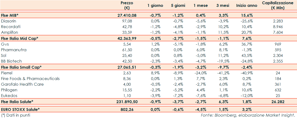 Nella seduta di ieri il Ftse Italia Salute ha riportato un -0,9% rispetto alla parità del corrispondente europeo e al -0,7% del Ftse Mib.