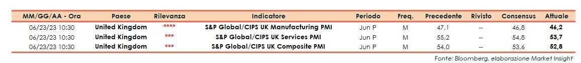 A giugno il dato preliminare del PMI S&P Global Manifatturiero del Regno Unito si è attestato a 46,2 punti, in calo rispetto ai 47,1 punti della rilevazione precedente e al di sotto del consensus (46,8 punti).