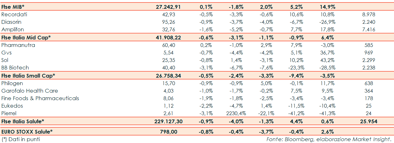 Nella seduta di ieri il Ftse Italia Salute ha riportato un -0,9% rispetto al -0,8% del corrispondente europeo e al +0,1% del Ftse Mib.