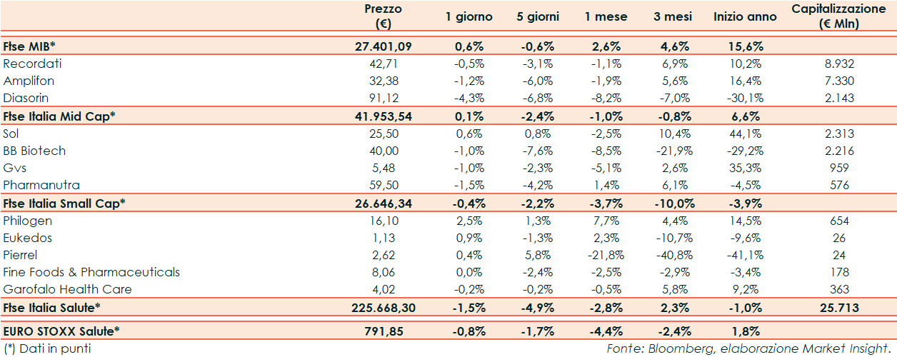 Nella seduta di ieri il Ftse Italia Salute ha riportato un -1,5% rispetto al -0,8% del corrispondente europeo e al +0,6% del Ftse Mib.