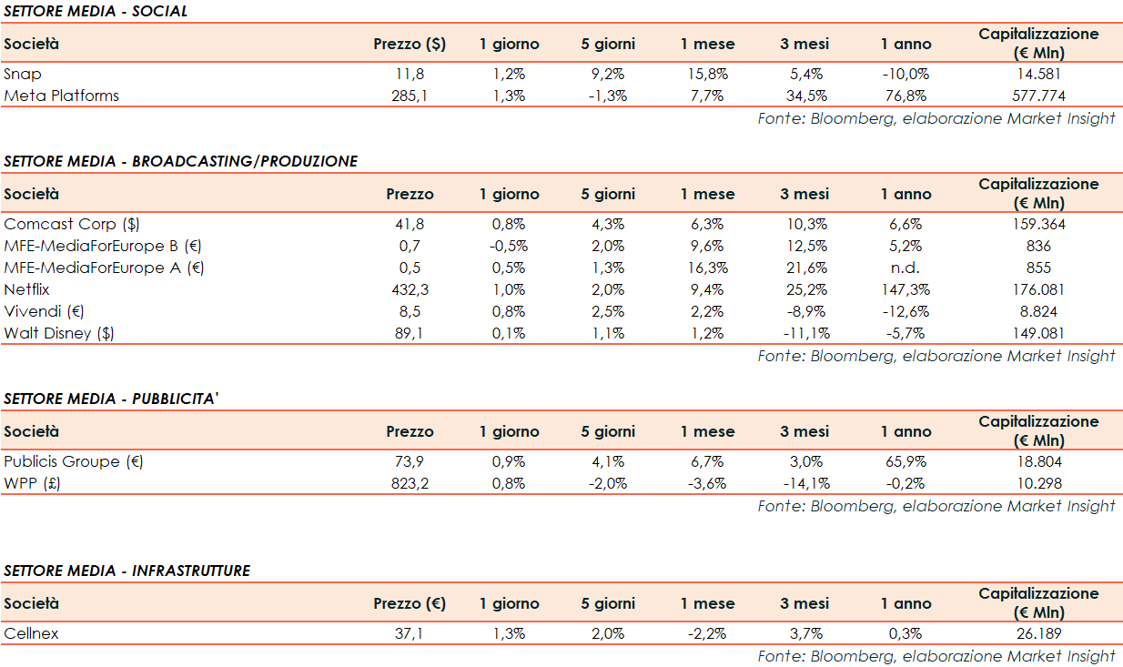 Si riporta l’andamento odierno dei principali titoli internazionali del settore media: