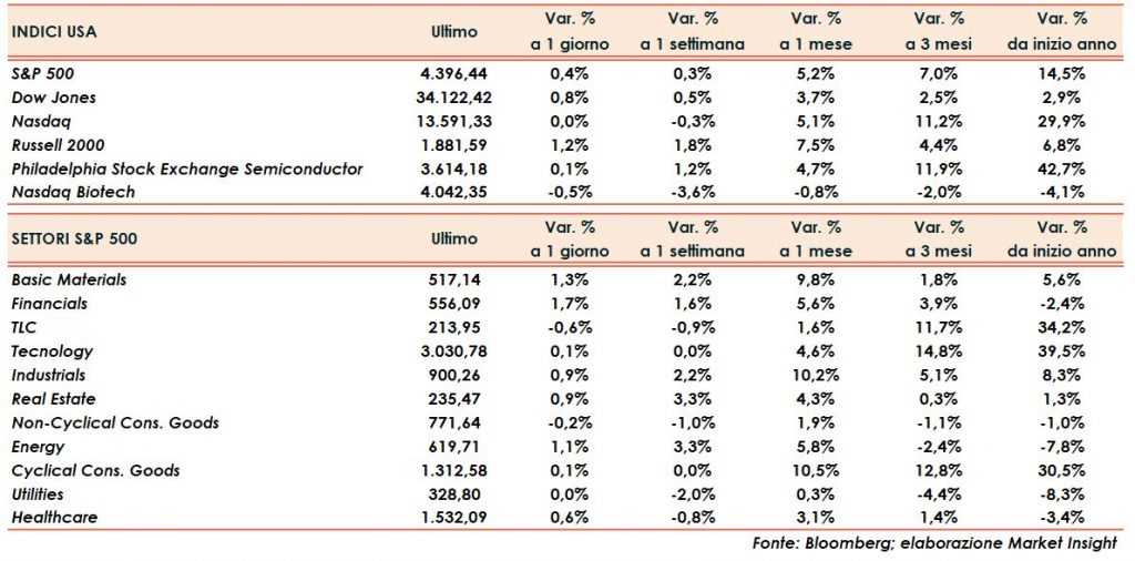 Nello specifico è il Russell 2000 (+1,2%) a tirare la volata, seguito dal Dow Jones (+0,8%), galvanizzato dalle performance dei titoli bancari presenti nell’indice, mentre più contenuto è stato il rialzo sia dello S&P500 (+0,4%) che del Nasdaq che ha chiuso praticamente invariato.
